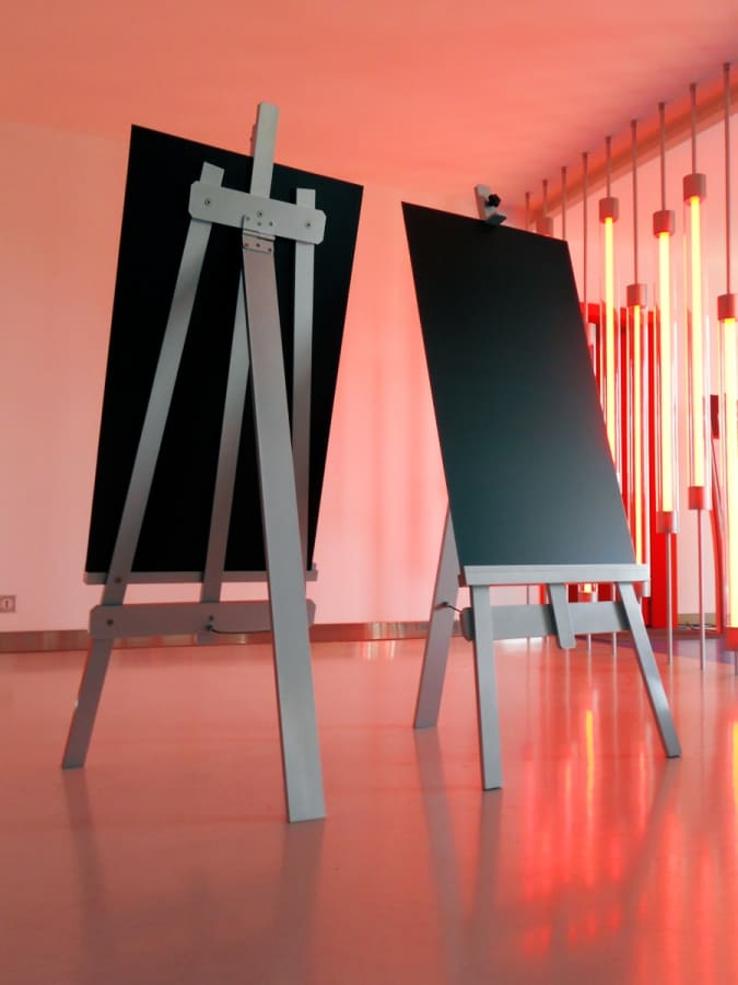Chevalets en aluminium plein laqué gris métallisé. Panneaux composites type Dibond avec revêtement ardoise.