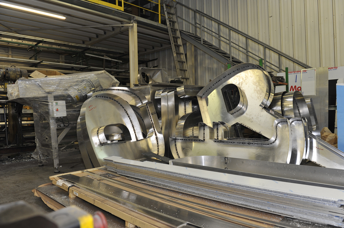 Lettres boîtiers en aluminium laquées rouge et noir. Chants et fonds soudés pour recevoir les faces en PMMA diffusant.