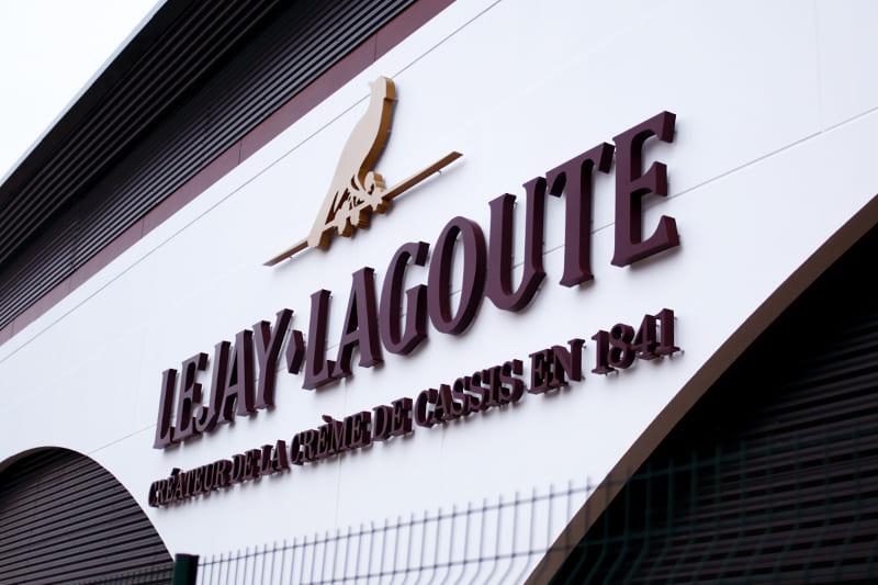 Ensemble de lettres et logo en relief. Faces et chants soudés en aluminium laqué bordeaux et champagne avec fixation en décollement par entretoises.